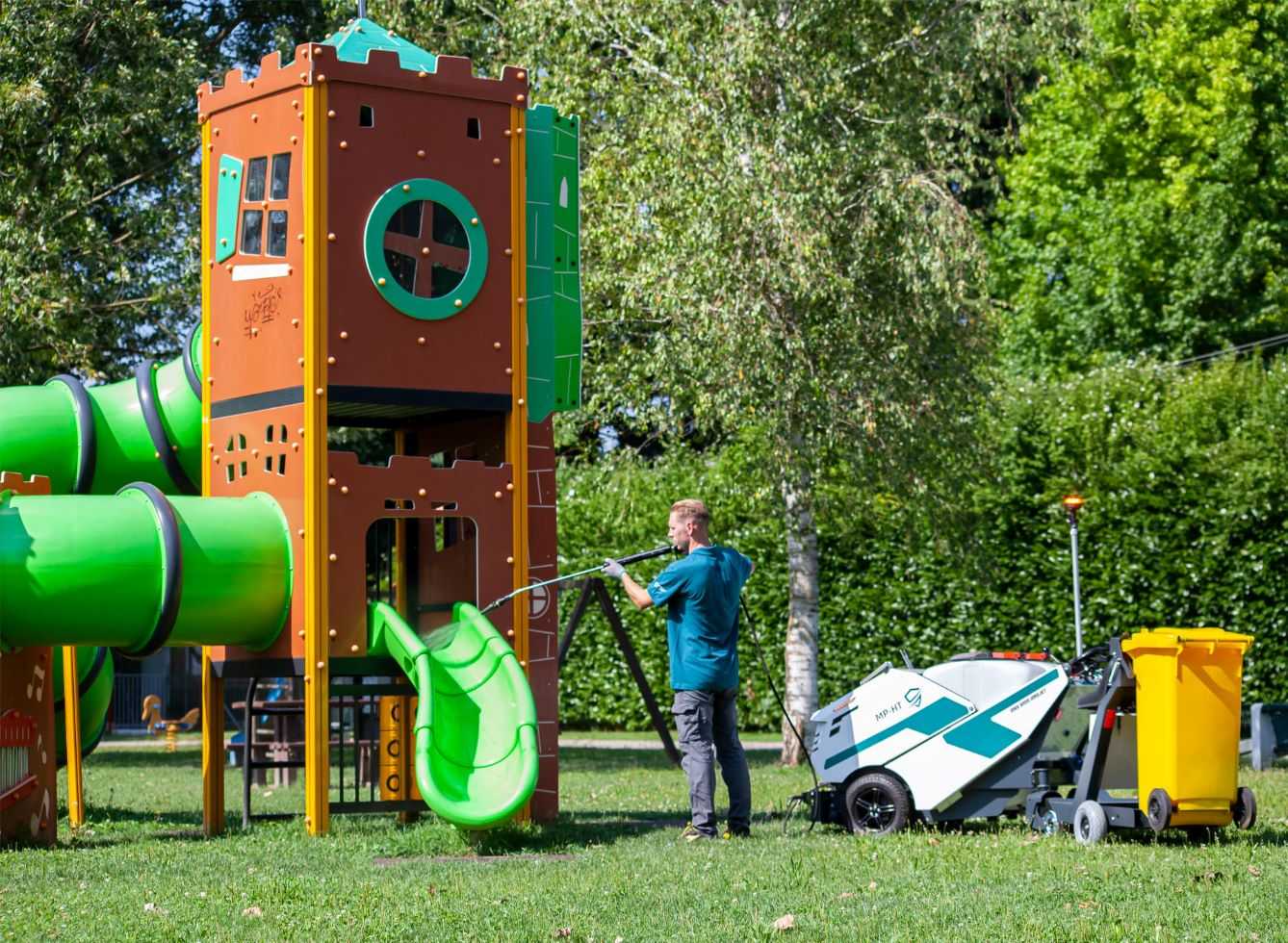 I parchi pubblici sono spazi ad alta frequentazione, in cui sporco, polvere, guano e residui organici si accumulano facilmente su panchine, giochi per bambini, cestini e pensiline.
